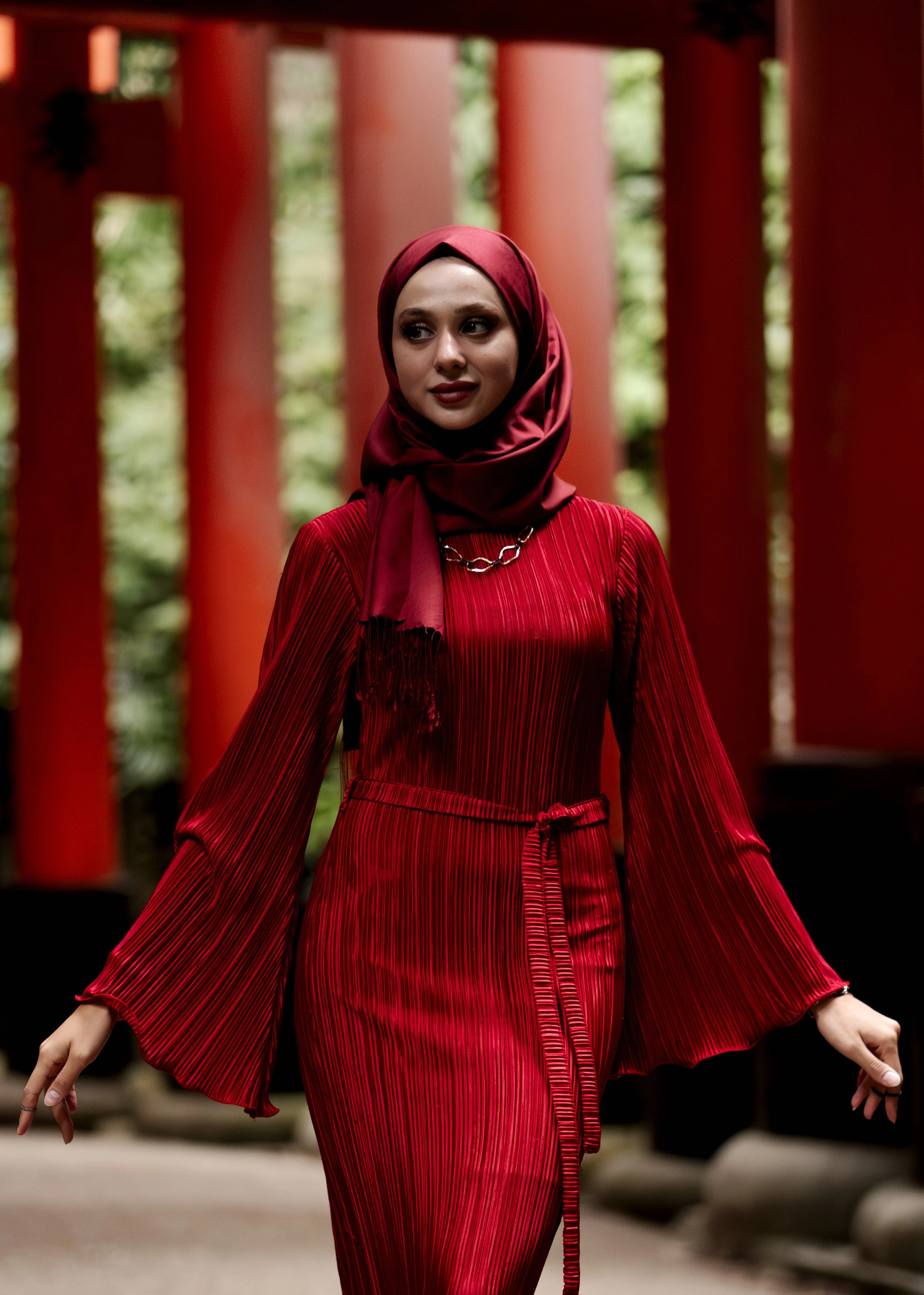 A woman wearing a red dress and matching hijab walking outdoors with red columns in the background.